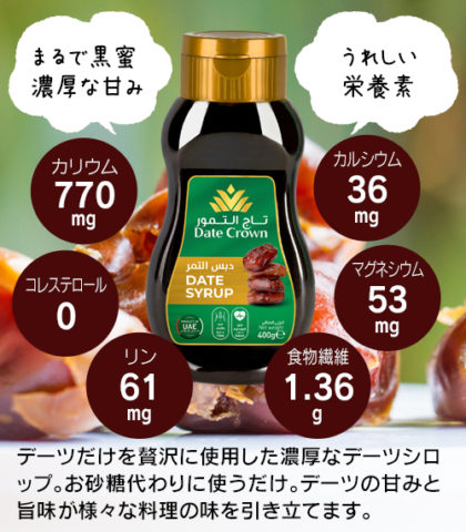 デーツシロップは、天然の美容サプリメントと評判のデーツの実だけを贅沢に搾った100%天然の果汁シロップ。豊富な栄養素がギュッと詰まっています。コクがあるのにスッキリした甘さが特徴で、くせもなく、初めての方にも食べやすい風味。タンパク質、食物繊維が豊富で、鉄分、カリウム、マグネシウム、リンなどをバランス良く含んでいます。砂糖不使用・添加物不使用・低糖質